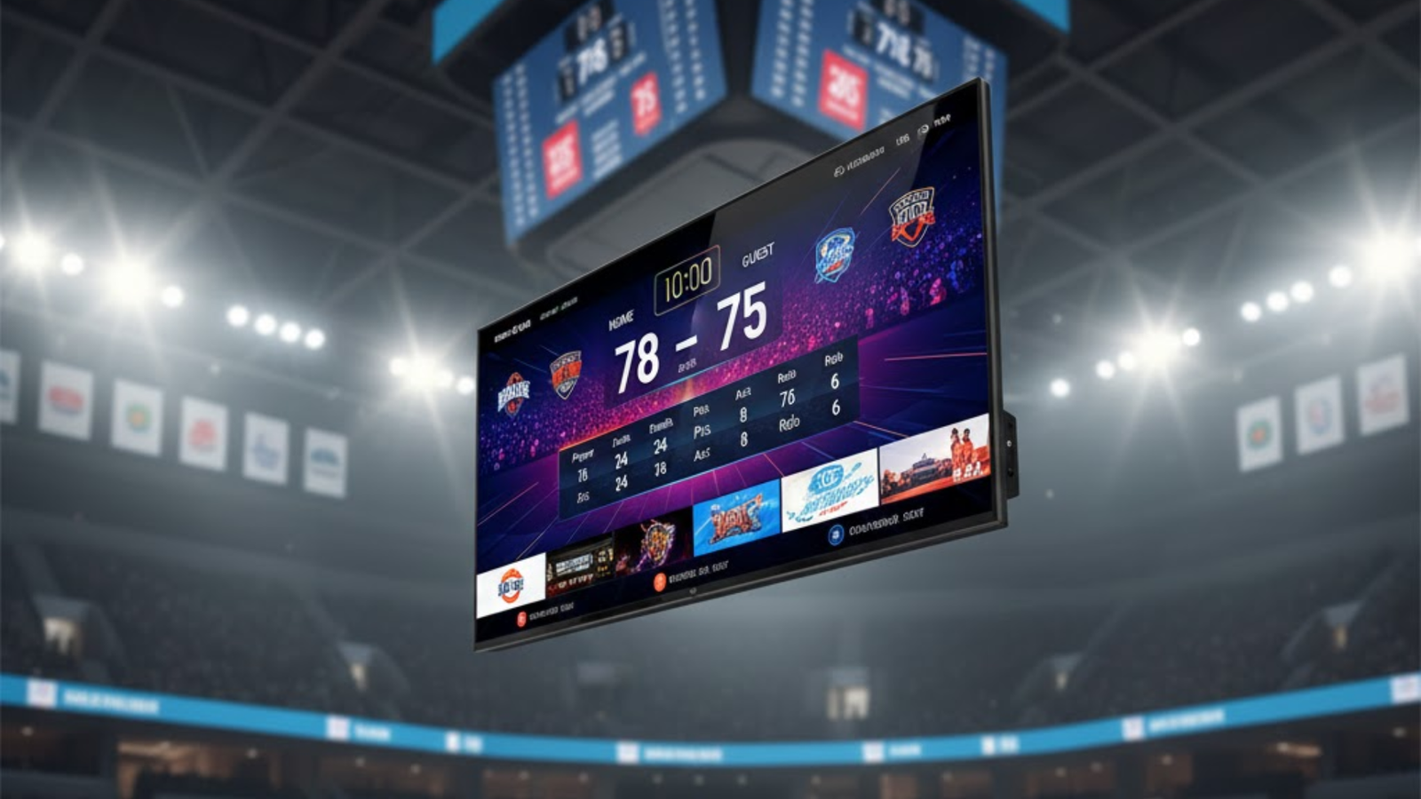 LED perimeter and video wall displays show live scores, player stats, and advertisements, enhancing spectator experience and generating advertising revenue.