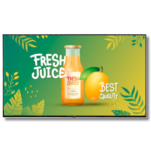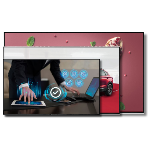 Depending on the size, displays support HD (1366×768), Full HD (1920×1080), or 4K UHD (3840×2160) resolutions for crisp and clear visuals.